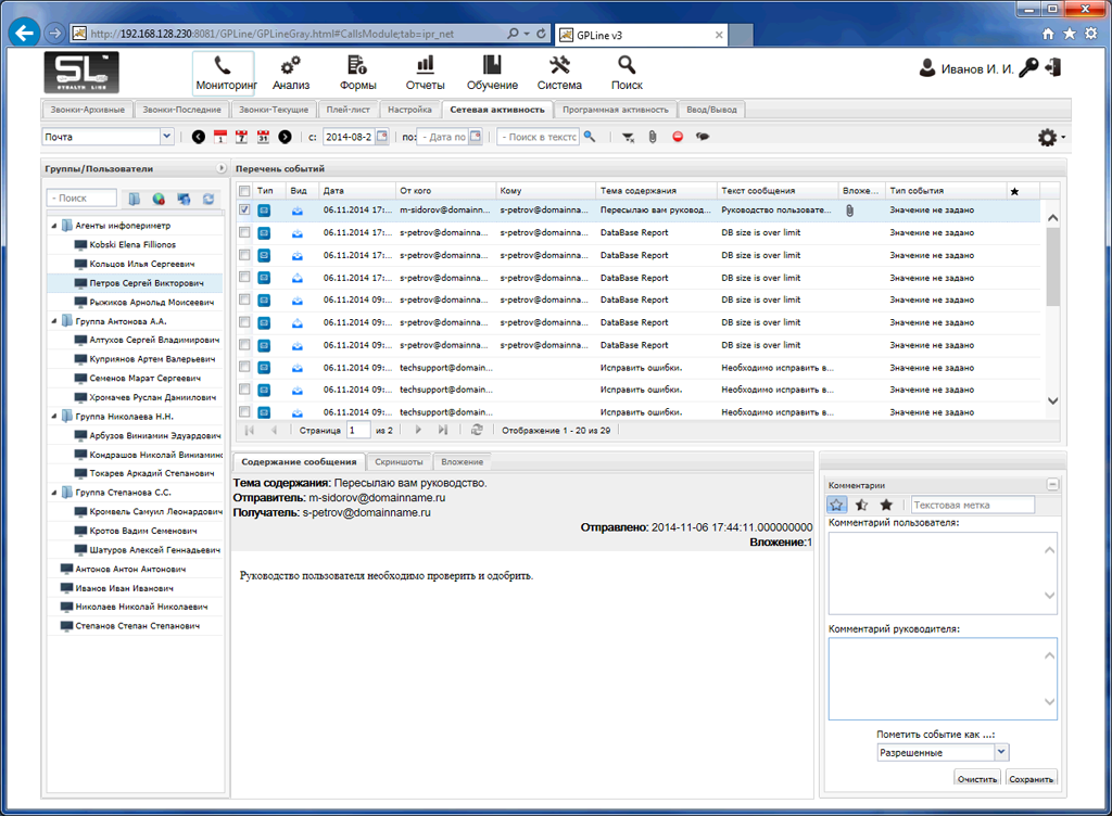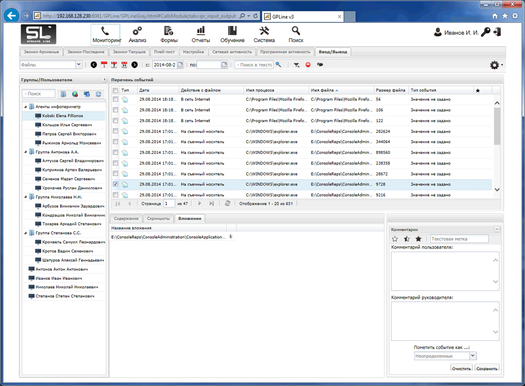 - “Показатели работы пользователей” - количество критических и запрещенных событий, активное и неактивное рабочее время.